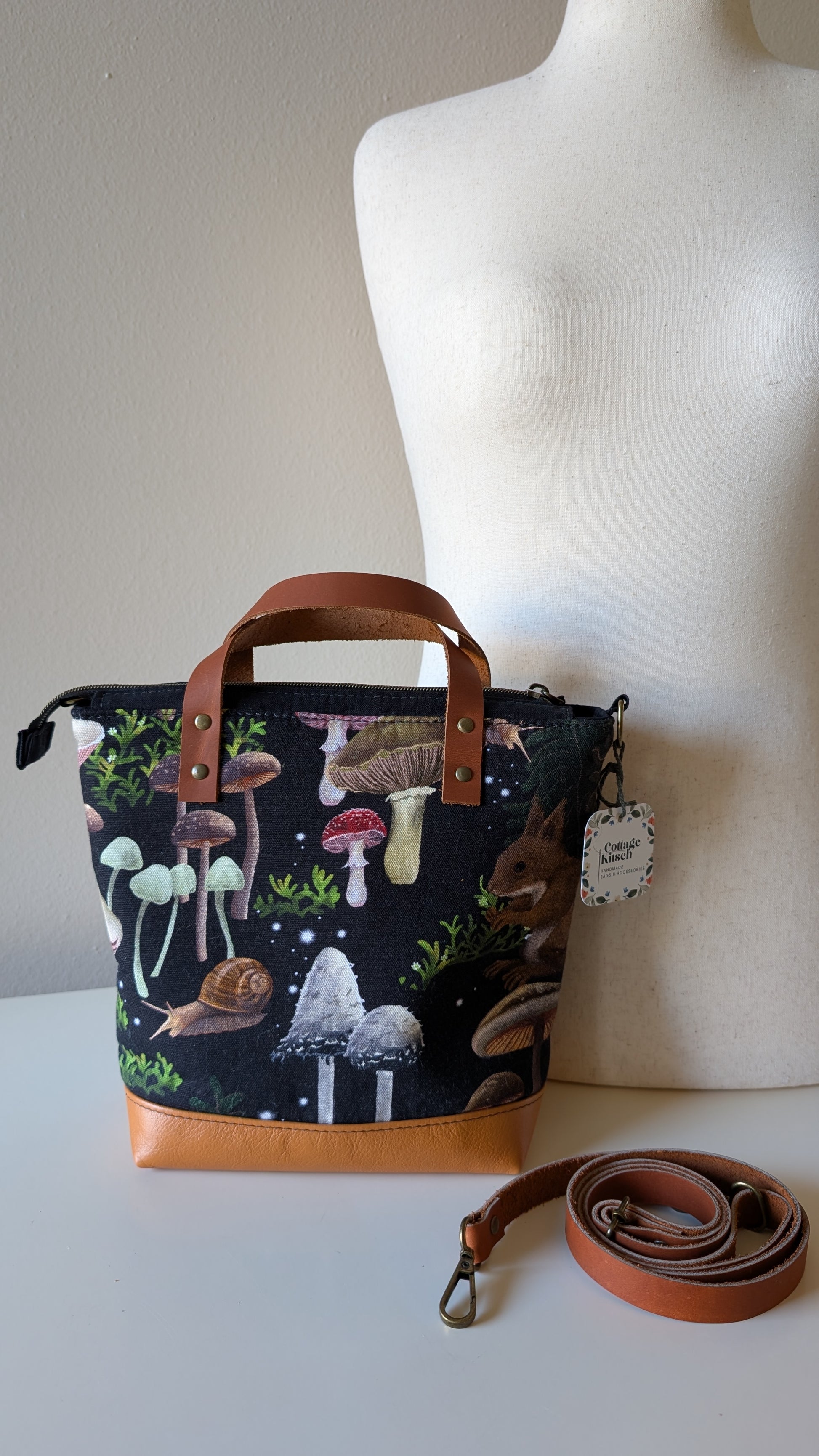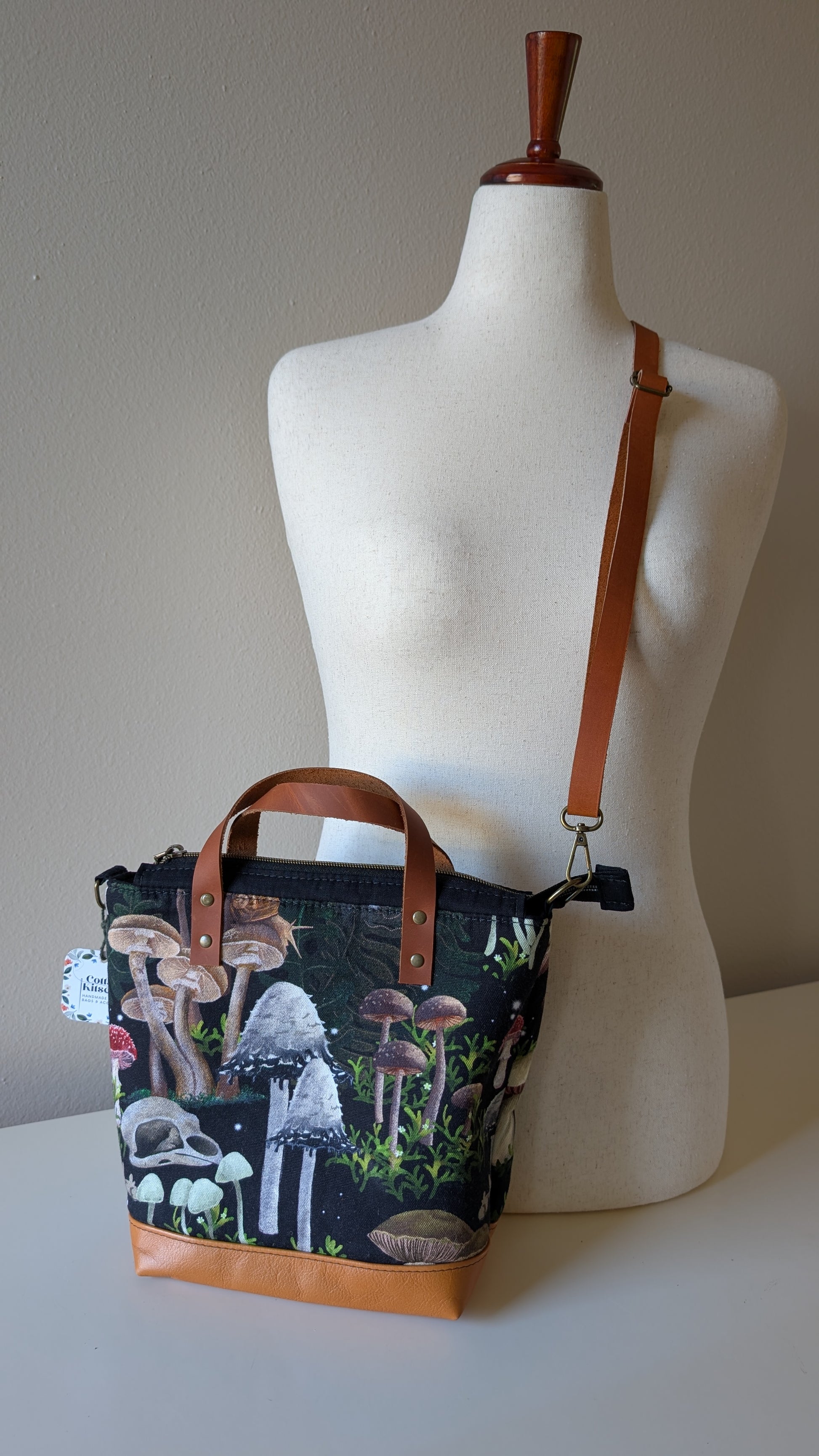This versatile bag features a zippered closure with 2 interior slip pockets. There are leather handles, and an included adjustable crossbody strap that can be removed. The base is also constructed of leather, while the printed material is cotton canvas. The interior is cotton linen.
